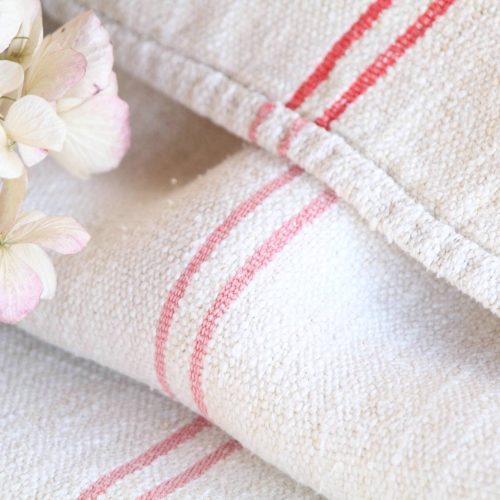 The unique advantages of linen fabrics were already known among the citizens of many ancient towns. Thanks to their robustness and tensile strength, they weren’t solely used as clothes, bed linen or table linen though, but also sewed up to linen bags in which grain was stored. It didn’t take long until they were called grainsacks. Nowadays grainsacks are still a beloved product, often used for decoration but also as an useful object. Friends of linen all around the world praise the advantages of these attractive grainsacks and use them as pillowcases, sew table runners out of their fabrics or use them to store bread, clothes or other things. Especially antique linen bags possess a special charm because of their colourful stripes, monograms, embroideries or washed out seals. We bought the grainsacks offered in our webshop all over the world. All of them are at least one hundred years old and they certainly would have unbelievable stories to tell.