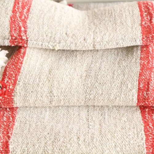 The unique advantages of linen fabrics were already known among the citizens of many ancient towns. Thanks to their robustness and tensile strength, they weren’t solely used as clothes, bed linen or table linen though, but also sewed up to linen bags in which grain was stored. It didn’t take long until they were called grainsacks. Nowadays grainsacks are still a beloved product, often used for decoration but also as an useful object. Friends of linen all around the world praise the advantages of these attractive grainsacks and use them as pillowcases, sew table runners out of their fabrics or use them to store bread, clothes or other things. Especially antique linen bags possess a special charm because of their colourful stripes, monograms, embroideries or washed out seals. We bought the grainsacks offered in our webshop all over the world. All of them are at least one hundred years old and they certainly would have unbelievable stories to tell.