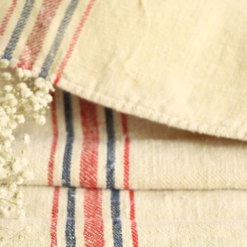 The unique advantages of linen fabrics were already known among the citizens of many ancient towns. Thanks to their robustness and tensile strength, they weren’t solely used as clothes, bed linen or table linen though, but also sewed up to linen bags in which grain was stored. It didn’t take long until they were called grainsacks. Nowadays grainsacks are still a beloved product, often used for decoration but also as an useful object. Friends of linen all around the world praise the advantages of these attractive grainsacks and use them as pillowcases, sew table runners out of their fabrics or use them to store bread, clothes or other things. Especially antique linen bags possess a special charm because of their colourful stripes, monograms, embroideries or washed out seals. We bought the grainsacks offered in our webshop all over the world. All of them are at least one hundred years old and they certainly would have unbelievable stories to tell.