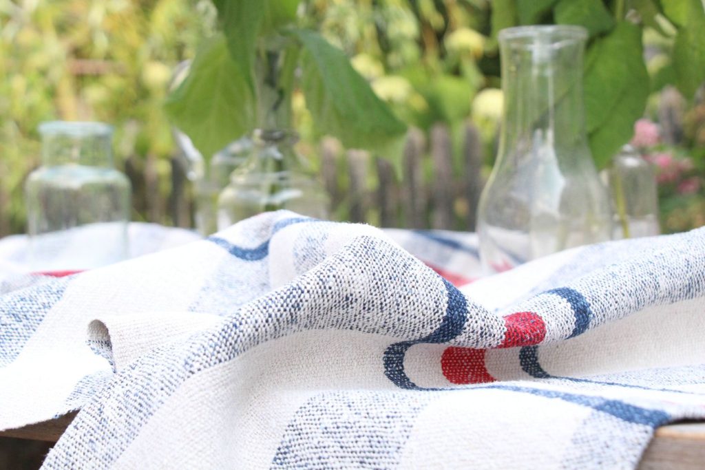 The linen itself has an OFFWHITE color and there are amazing BLUEBERRY BLUE and STRAWBERRY RED stripes on it, what a treasure.