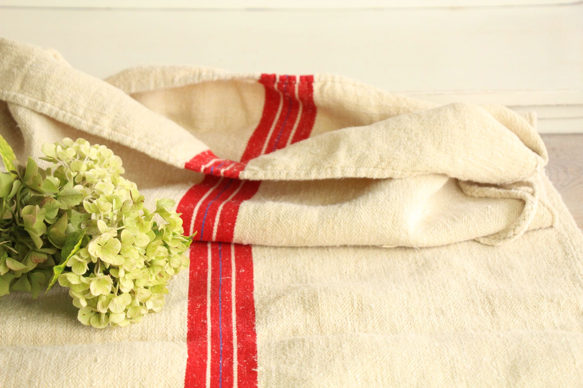 These antique grain sacks and linen rolls were made around 1900-1909