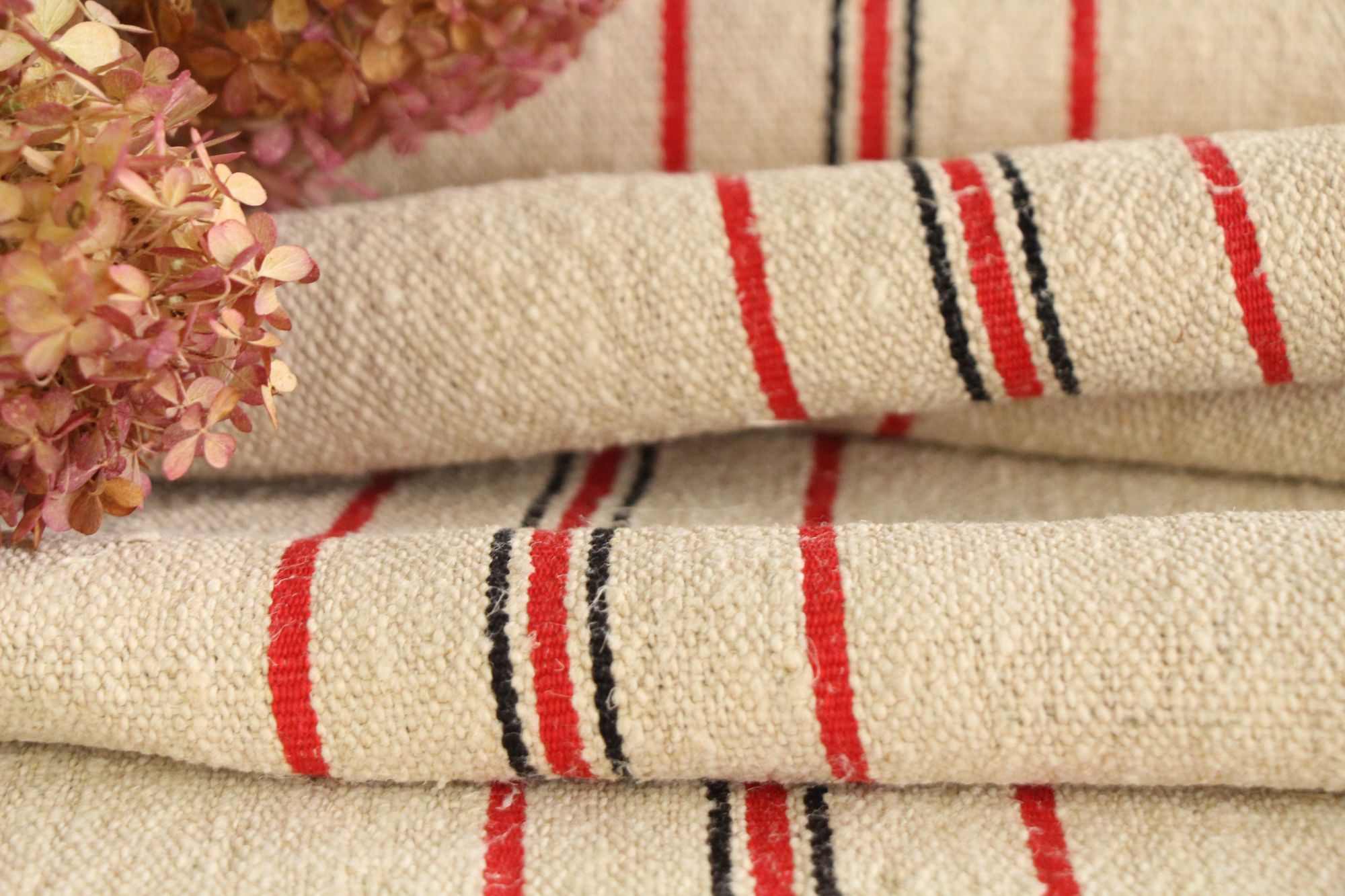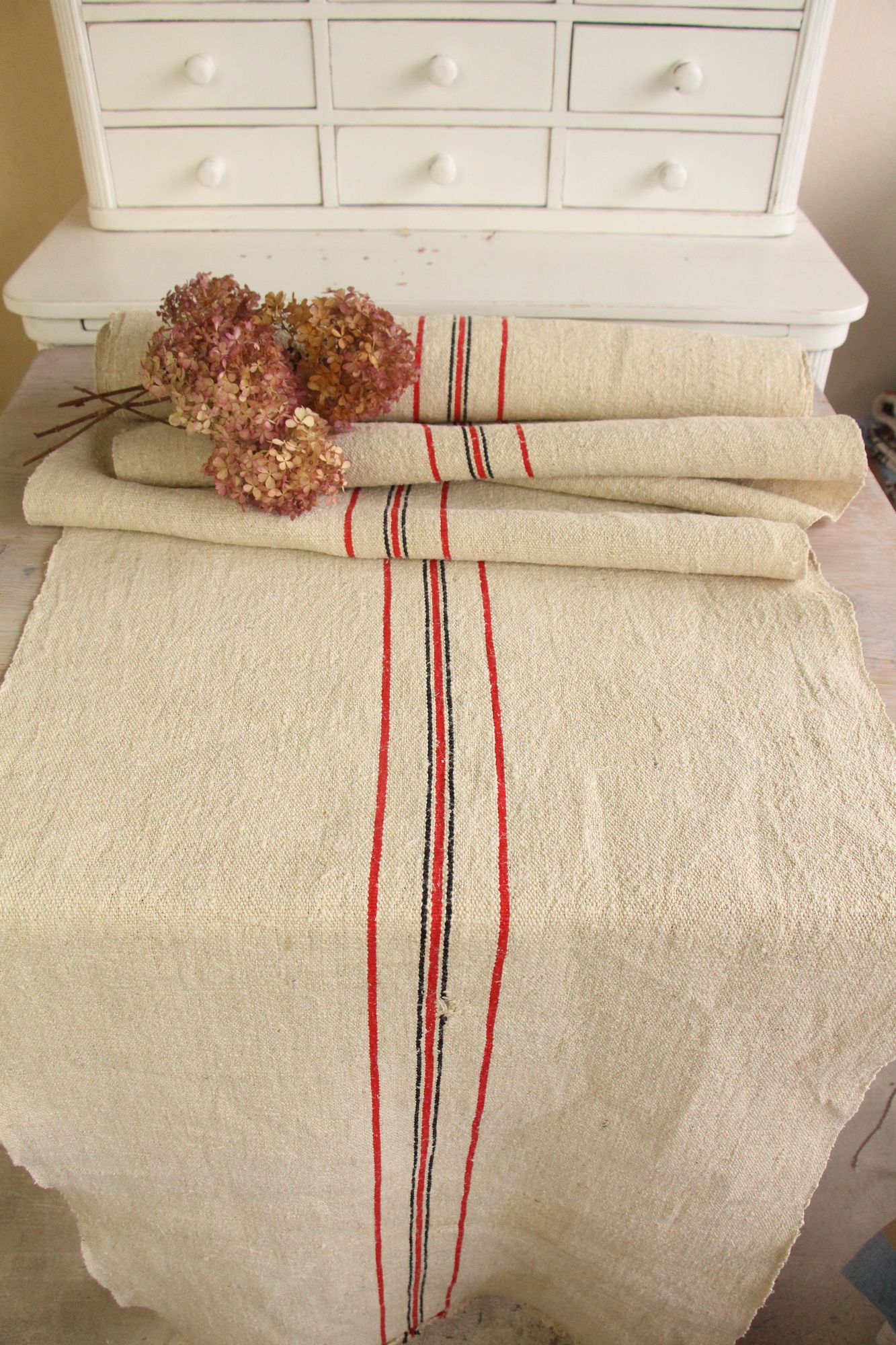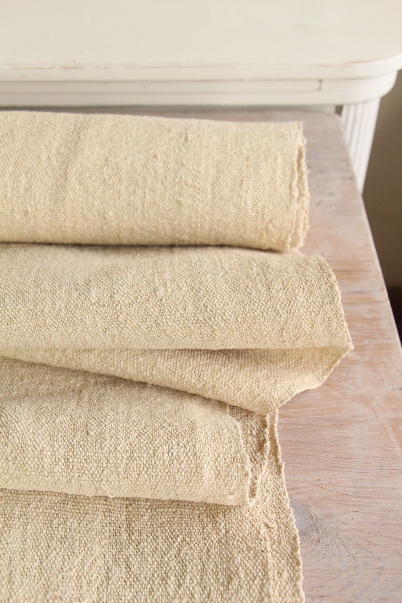 Alle unsere Leinenrollen und Getreidesäcke sind in ihrer Textur und Farbe einzigartig, aber sie alle sind wunderbare Schätze textiler Volkskunst. Sie sind 100 % biologisch und völlig frei von chemischen Substanzen, frisch gewaschen, einwandfrei sauber und bereit für Ihre kreativen Projekte.