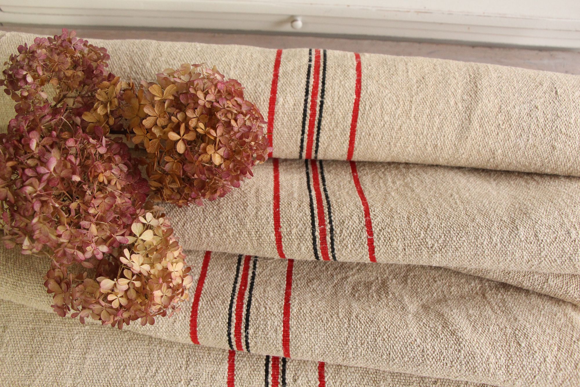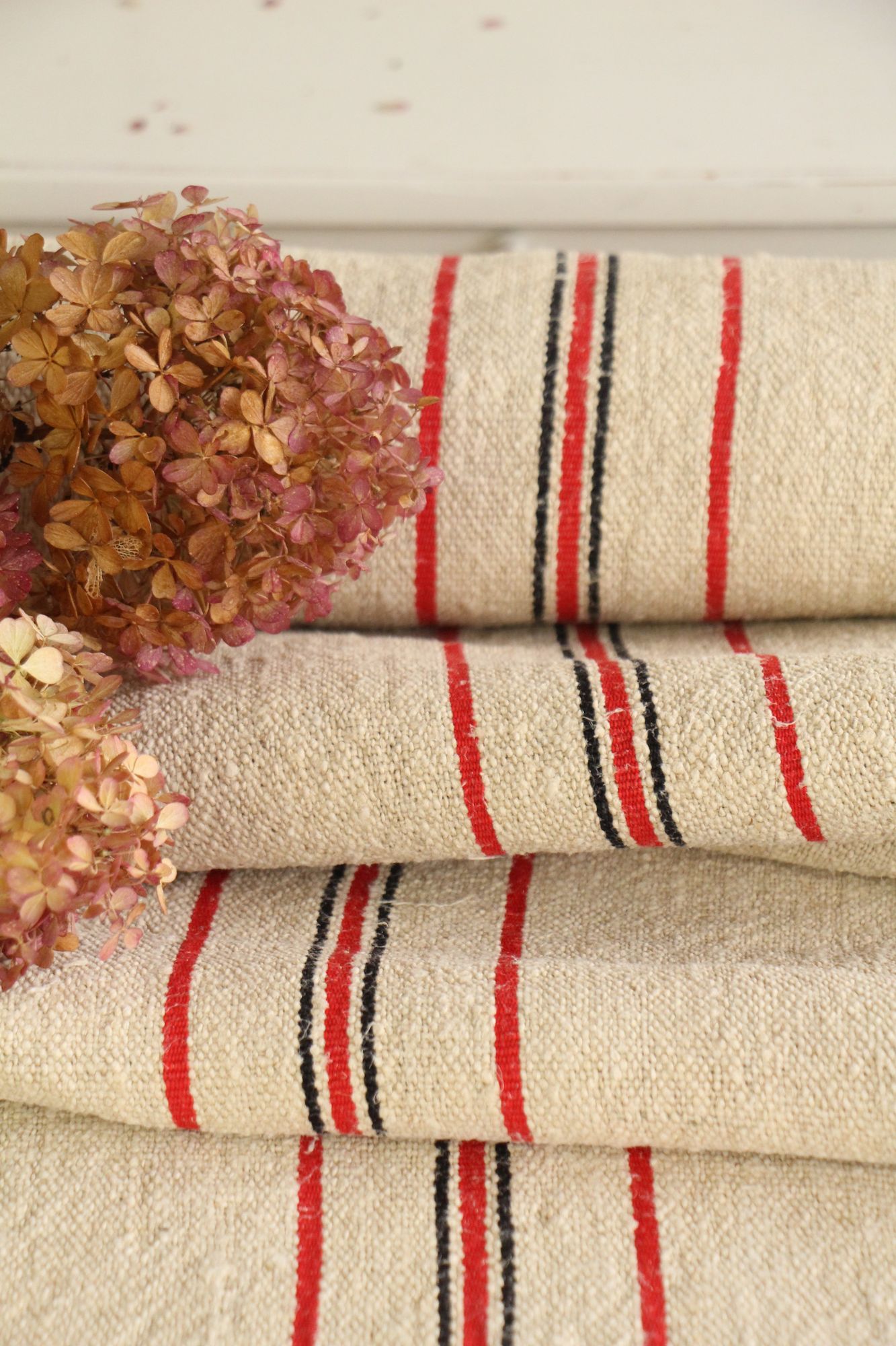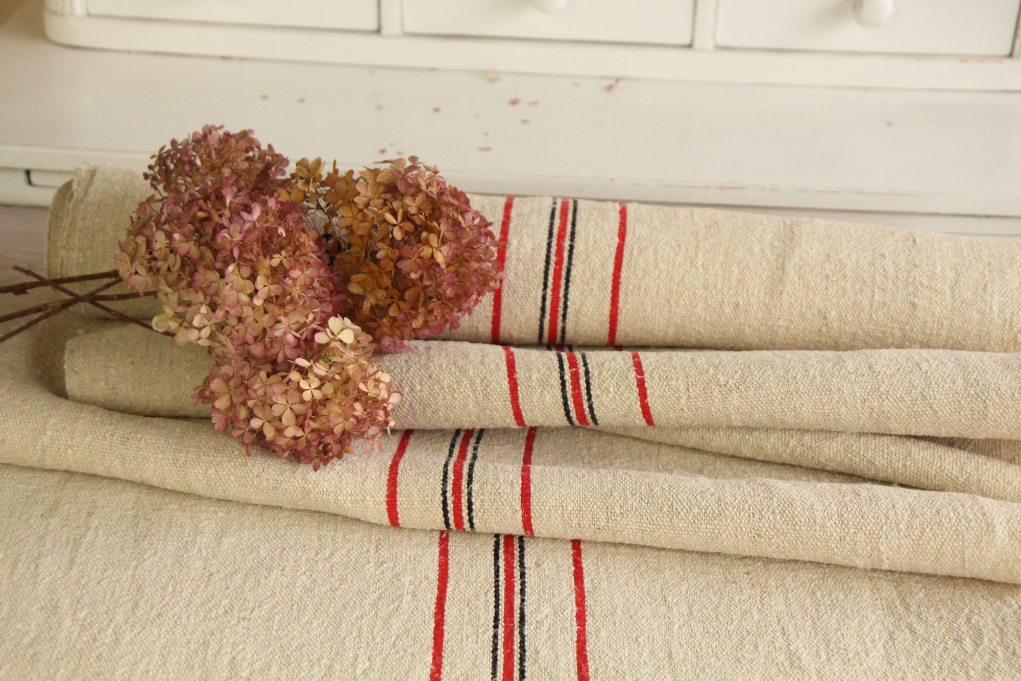 Alle unsere Leinenrollen und Getreidesäcke sind in ihrer Textur und Farbe einzigartig, aber sie alle sind wunderbare Schätze textiler Volkskunst. Sie sind 100 % biologisch und völlig frei von chemischen Substanzen, frisch gewaschen, einwandfrei sauber und bereit für Ihre kreativen Projekte.