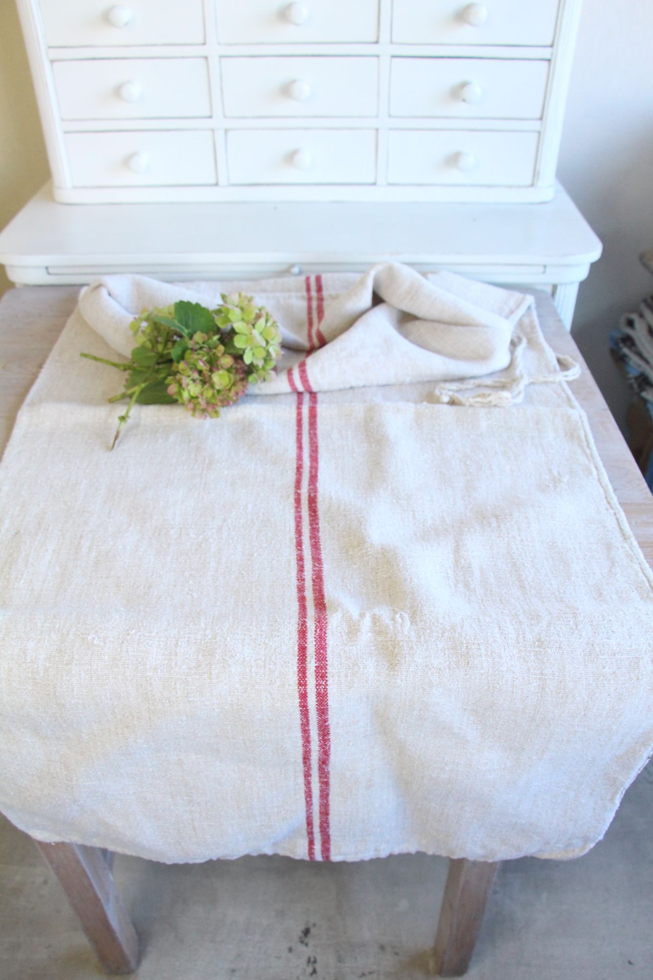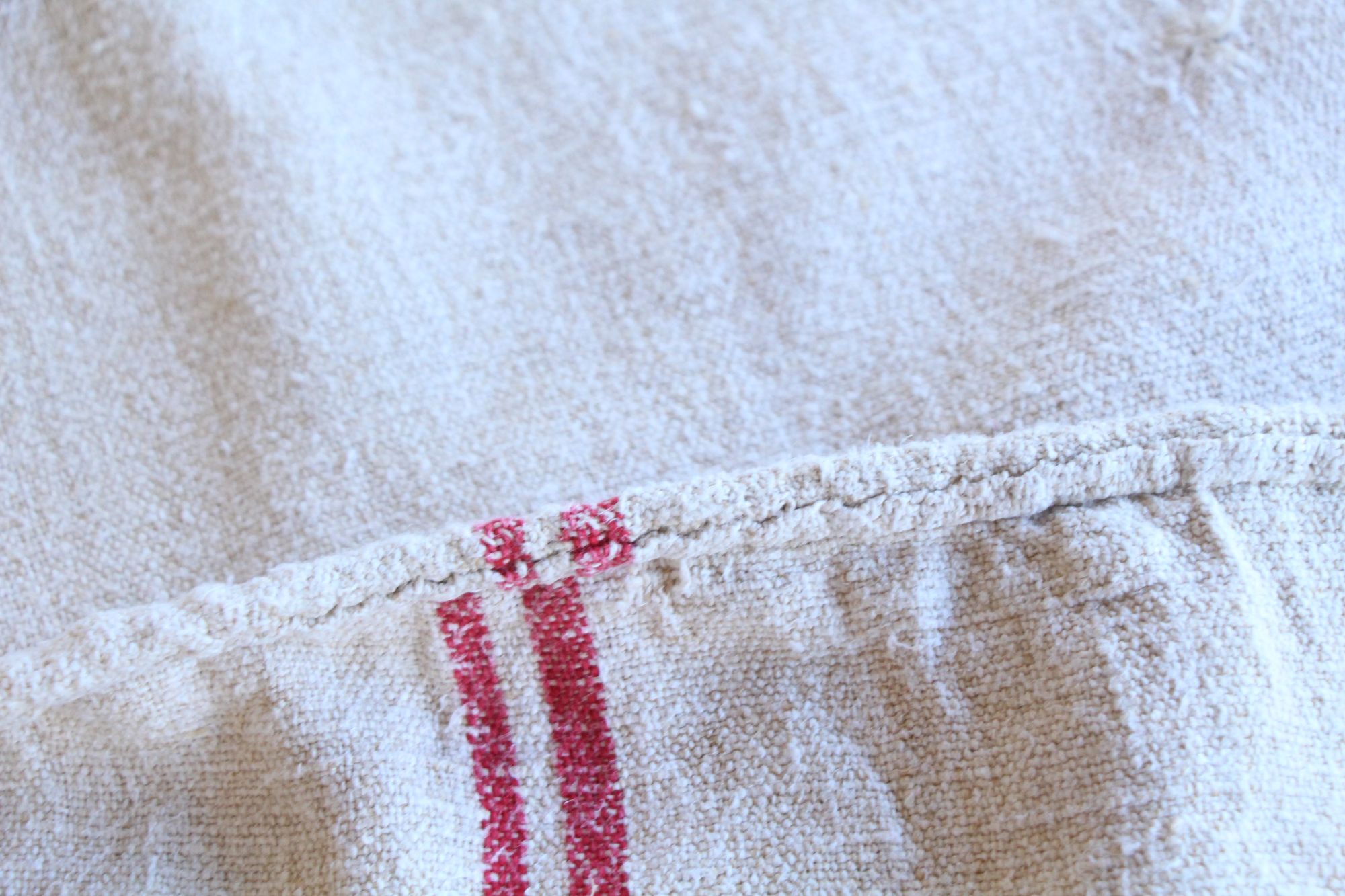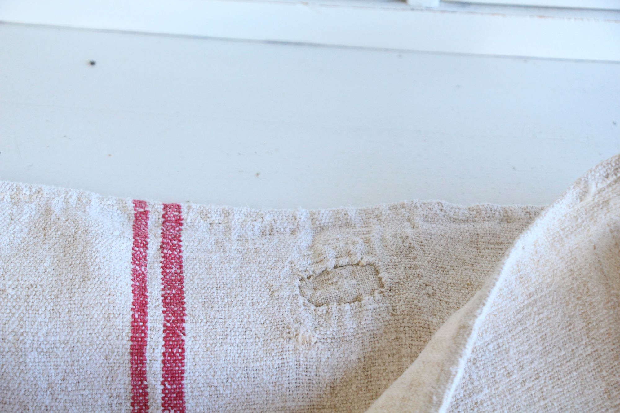 Besonderheit: Im Laufe der Zeit sind am Getreidesack charmante handgenähte Flicken und kleine Beschädigungen entstanden, die auf den Fotos zu sehen sind.