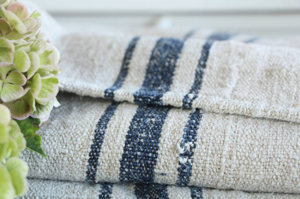 antiker Getreidesack aus Leinen, Wabi Sabi, französisches Bauernhausdekor, Tischläufer, DIY-Polsterung, TIEFSEE BLAU gestreift L 361