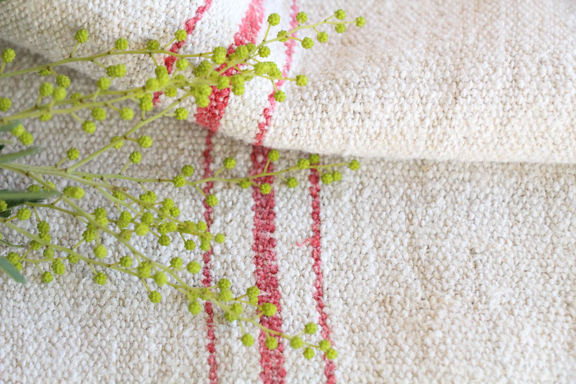 Jede Rolle oder jeder Leinensack ist anders und einzigartig in Textur und Farbe, aber alle sind wunderbare Stücke textiler Volkskunst, alle Leinen- und Getreidesäcke sind 100 % biologisch und organisch, völlig frei von chemischen Substanzen